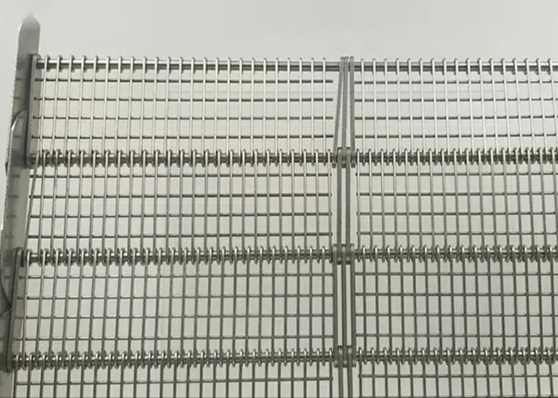 Göz bağlantılı konveyör bantları, çapraz çubuklara yerleştirilen göz bağlantılarından oluşur ve ürünlerin ulaşılması zor olan "boşluklarda" birikim oluşturmasını imkansız hale getirir. Bandın hafif tasarımı, dişliler veya tahrik tamburu aracılığıyla pozitif tahrik ile kolay temizlik ve onarım sağlar. Bu yapı, direksiyon sorunları olmadan mükemmel bant çalışmasını sağlayan nispeten küçük çapların kullanılmasına olanak tanır.